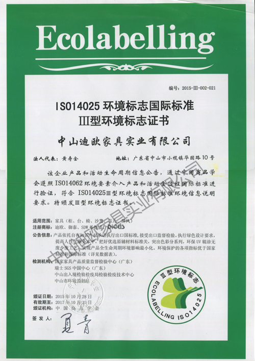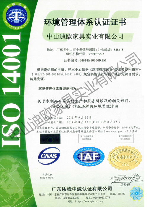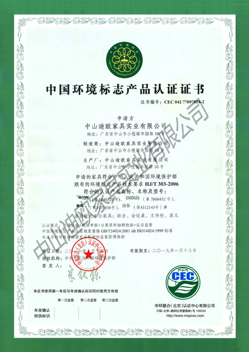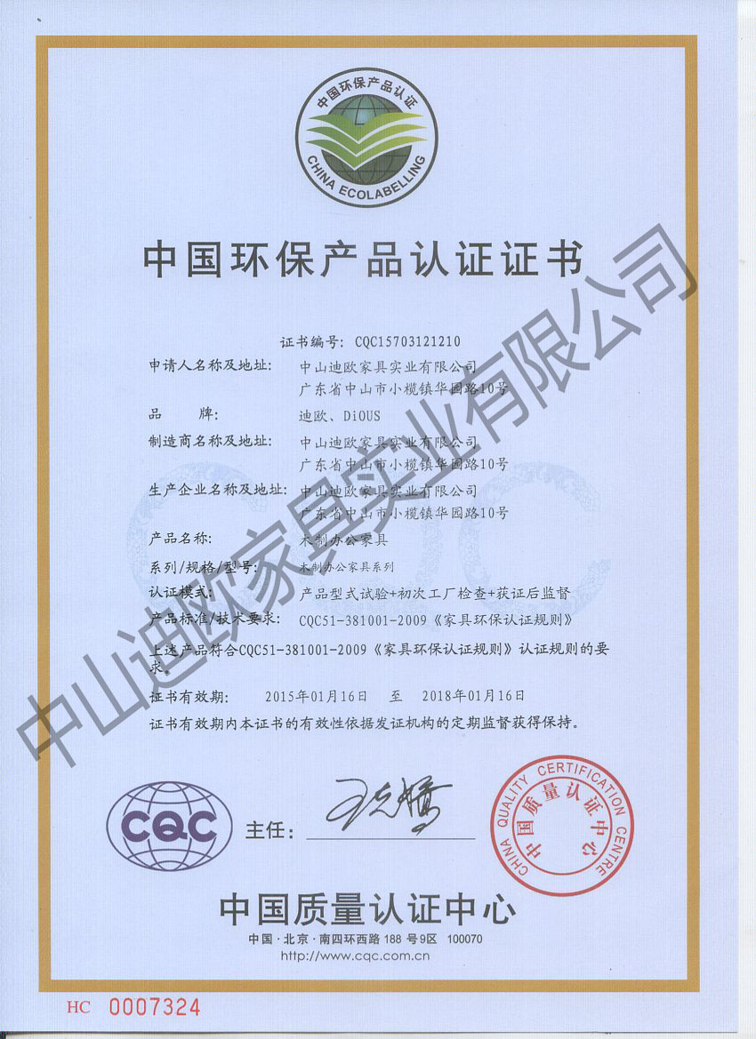 CQC木制办公家具中国环保产品认证证书